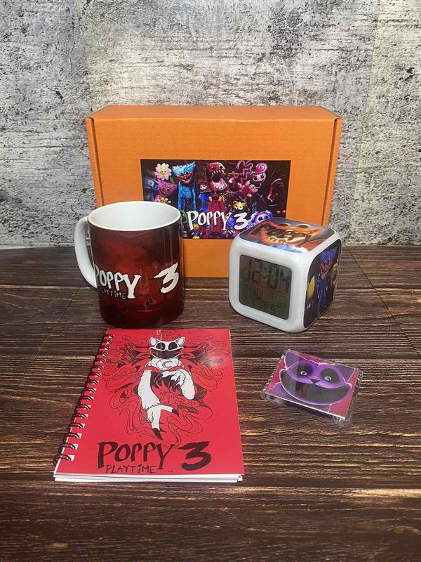 В набор Poppy Playtime входит: 1) Часы будильник хамелеон размер 8/8/8 см Очень эффектная и нужна вещь! Меняет цвет, отлично смотрится в темное время. Термометр покажет температуру в комнате, а будильник позволит не опоздать на занятия и встречу с друзьями. 2) Чашка, премиум керамика глянцевая поверхность и качественный рисунок. Объем чашки 330 мл, высота 9,5 см. 3) Блокнот для рисования формат А6 40 белых листов, картинка спереди из заду. 4) Магнит с любимыми персонажами 7*7см. 5) Коробка оранжевого цвета 34/24 см с подарочным наполнением. Если возникнут вопросы воспользуйтесь чатом мы с радостью ответим Вам.