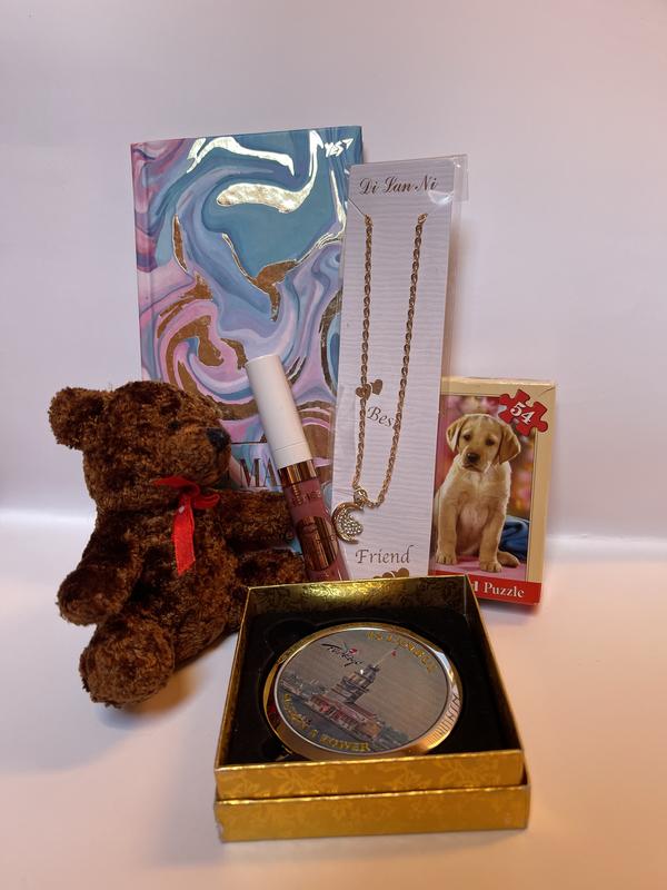 Бокс с маленькими подарками 1 - блокнот 2 - мягкий медведь 3 - цепочка 4 - блиск для губ 5 - пазли 6 - дзеркало 7 - закладка