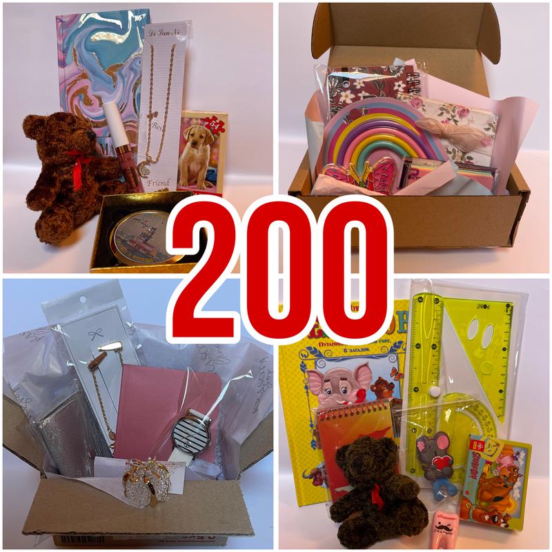 Отдаю по 200 любую коробку с подарками. Содержание каждой коробки находится на фотографиях. - первый бокс входит (резинка, стикеры, блокнот, скрипки, игра лабиринт и часы) - второй бокс (блокнот, мягкий медведь, пазлы, бальзам для губ, зеркало, кулон) - третий бокс (блокнот, часы, кошелек, статуэтка подарка, и заколка на волосы) - четвертый бокс (книга, блокнот, мягкий медведь, пазлы, точилки, набор линеек, держатель зубной щетки)