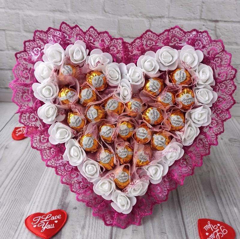 Букет с конфетами необычный подарок для любимой в форме сердца на день влюбленных