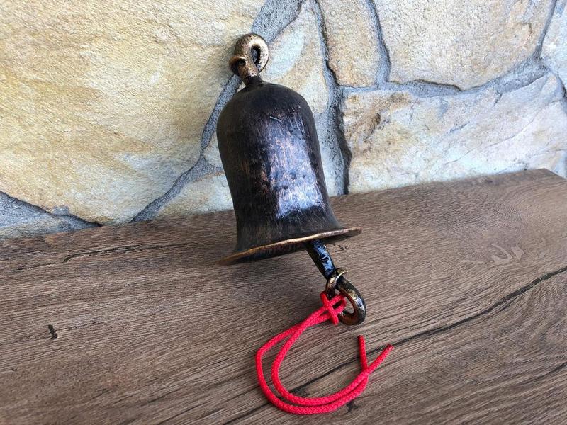 Вот кованый вручную металлический колокольчик с красивой закрученной/прокрученной ручкой, идеальный как подарок для многих случаев и замечательный элемент домашнего декора. Этот колокольчик - настоящее искусство ковки и уникальный подарок на любые праздники! Размеры: - Высота (с ручкой): 14 см - Высота (без ручки): 10 см - Внешний диаметр: 11 см - Вес нетто: 0,5 кг Цвет: черный, покрытый медным и немного золотым налетом. Это изделие изготовлено вручную, поэтому ручки и размеры могут немного отличаться, что придает ему особенности и уникальности.