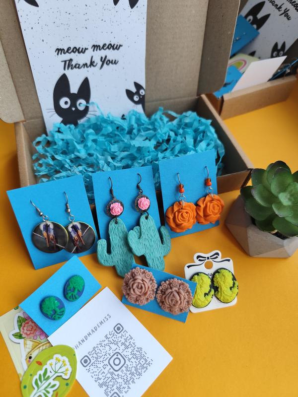 Подарочные боксы с серьгами ручной работы. в набор входит : -6 разных пар сережек хэндмейд -мыла открытка с котиками, мяу 😺 -коробочка -стикеры,визитка, наполнитель. оберы исключительный тематический подарок для своих родных,подруг,себе. быстрая пересылка нп или Укрпочтта. оплата на карту Порядкочность гарантирую.