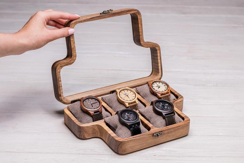 Дерев'яна цільна скринька для 5 годинників зі скляною кришкою з ініціалами