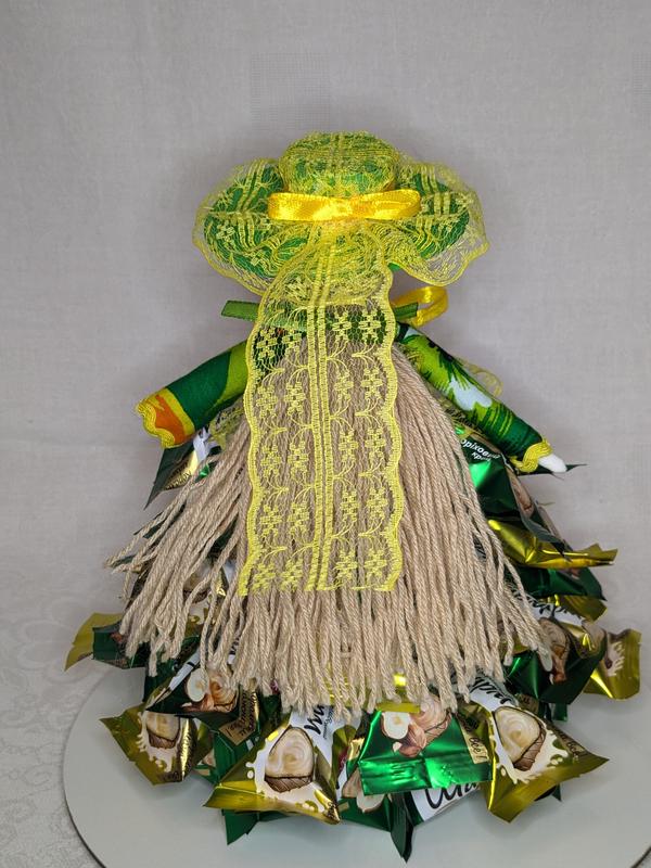 Куклости мотанка + сладкий подарок. У куколки два платья. Ее личная, яркая + платье из конфет. Это очень оригинальный подарок 2 в 1. Куколка мотанка ручной работы. Выполнена из натуральных материалов и с соблюдением технологии намотки. Платье из конфет выполнено отдельно. Куколка мотанка прочно в ней держится. Подарок 2 в 1: Предохранение ручной работы + вкусные конфетки.