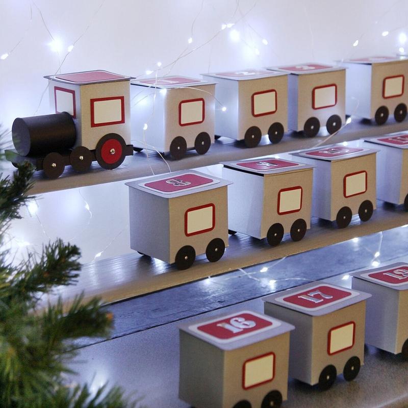 Набір для створення адвент календаря Адвент календар - Новорічний поїзд. Зворотний відлік до Різдва та Нового року! Комплект включає в себе 32 коробочку у формі вагончиків та локомотив для невеликих частувань, записок із завданнями і підказками для пошуку більших подарунків. Використовуйте адвент календар щоб відраховувати дні до Різдва та Нового року. Цей чудовий набір адвент-календаря можна зібрати і склеїти разом з дітьми, і це буде додатковою радістю в очікуванні свята! ▶ Ви отримаєте: - 32 шаблона ручної роботи з дизайнерського картону (комплект для 1 локомотива і 31 вагона), набір чисел від 1 до 31 і всі необхідні прикраси в подарунковій упаковці. - відео з інструкцією зборки на імейл ▶ Розмір: - 10cm x 6cm x 7cm висота - 7cm x 6cm x 7cm висота