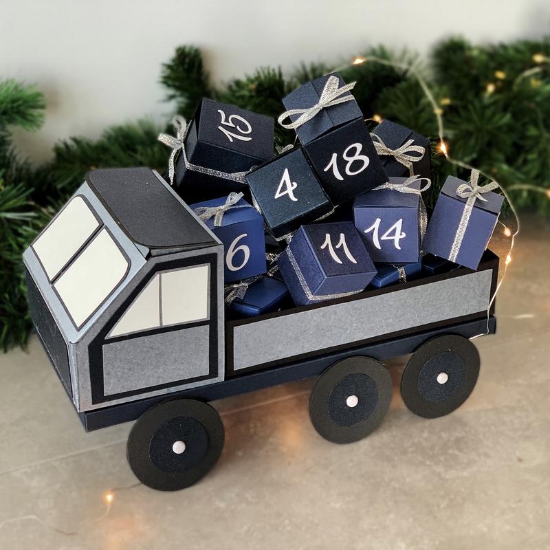 Набір для створення адвент календаря Адвент календар - Вантажівка. Зворотний відлік до Різдва та Нового року! Комплект включає в себе Вантажівку та 31 коробочки для невеликих частувань (записок із завданнями і підказками для пошуку більших подарунків). Використовуйте адвент календар щоб відраховувати дні до Різдва та Нового року. Цей чудовий набір адвент-календаря можна зібрати і склеїти разом з дітьми, і це буде додатковим задоволенням в очікуванні свята! ▶ Ви отримаєте: - Вантажівку та 31 шаблон коробочок ручної роботи з дизайнерського картону , набір чисел від 1 до 31 і всі необхідні прикраси в подарунковій упаковці. - відео з інструкцією зборки на імейл ▶ Розмір: Вантажівка - 32cm x 13cm x 15cm висота Коробочки- 4cm x 4cm x 4cm