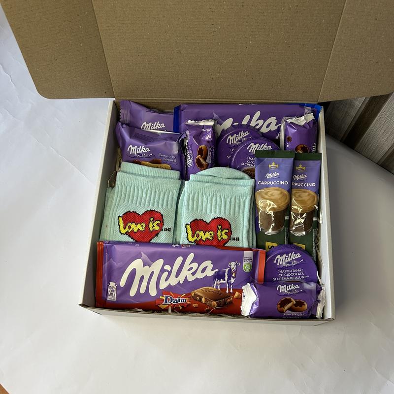 Женский подарочный бокс с носками и сладостями milka на день рождения