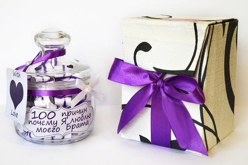 Шикарный подарок для Вашего любимого Брата. Декорированная баночка ручной работы. Баночка содержит 100 свитков на каждом из которых написана 1 причина любви. Все причины разые. Этот подарок не просто удивит, но и запомнится на долго. Баночка в комплекте с коробочкой. Пересылаю по 100% предоплате новой почтой или укрпочтой.