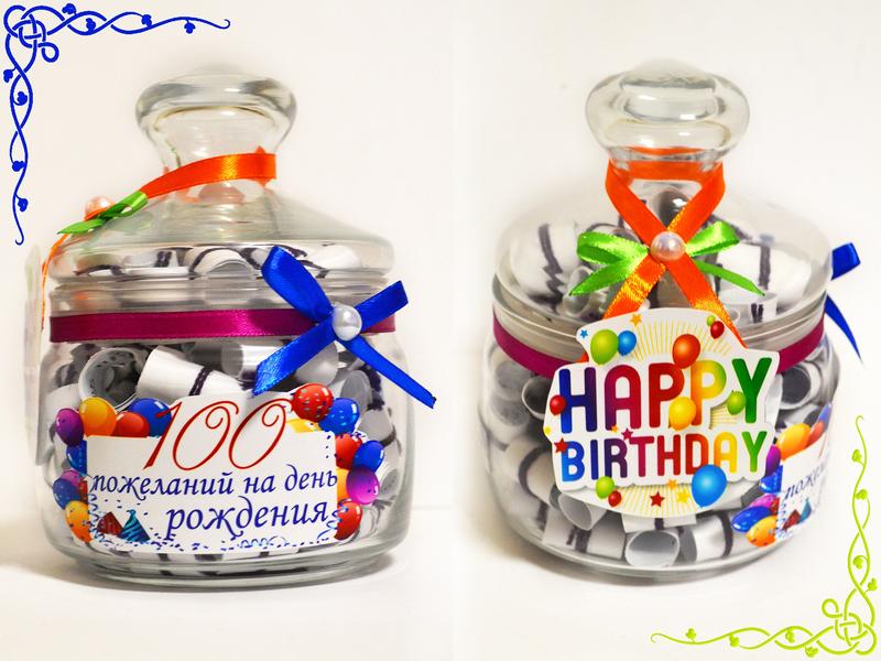 Декорированная баночка - 100 пожеланий на день рождения. Баночка содержит 100 свитков на каждом из которых написана 1 пожелание на день рождения. Этот подарок не просто удивит, но и запомнится на долго. Осчастливите именинника подарив такую баночку. Баночка в комплекте с коробочкой. Пересылаю по 100% предоплате Новой почтой или Укрпочтой.