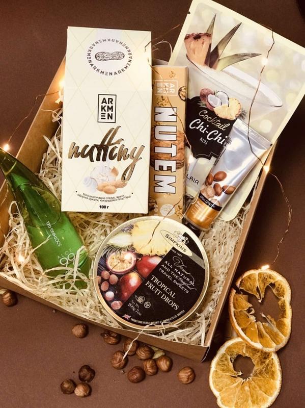 Подарочный набор Ореховый Рай предназначен, для любителей Орешек. Понастоящему подарит хорошее натроение, улыбку, радость, восторх и энергию на весь день. В этом наборе заложенны все секреты красоты. Ваш подарок непременно будет в приоритете. В состав входит: - Орехи в белой шоколадной глазуре - 100 г. - Ореховый батончик - 60 г. - Леденци Simpkins - 200 г. - Крем для рук - 20 мл. - Увлажняющая тканевая маска для лица - 1 шт - Увлажняющий гель для дица и тела - 55 мл. - Подарочная упаковка. *Если вы хотите внести свои коррективы в данный набор (что то добавить, что то убрать) обязательно говорите об этом и мы постараемя сделать это! Срок изготовления 1-2 дня