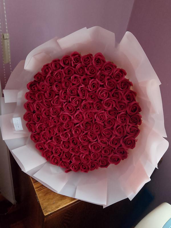 мыльная 101 роза, подарит невероятный аромат. Долго будет стоять и милить Ваш глаз. P.S. не использовать как мыло,адже может вызвать аллергические реакции. Лучше пусть просто украшает Ваш интерьер Отправлять могу в любое время, поэтому если Вам срочно нужен подарок — пишите