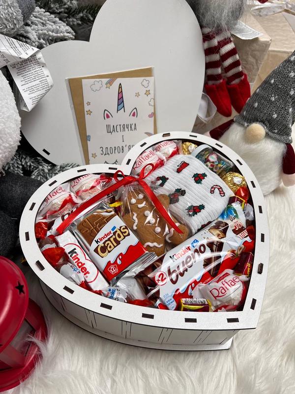 ▫️У бокс входить: 🎄деревянная коробка в виде сердца 🎄открытка 🎄новогодний носок 🎄kinder bueno 🎄kinder bueno палочка 🎄kinder cards 🎄kinder chocolate 🎄kinder choko bons -4x 🎄raffaello -5x 🎄Ferraro rocher -2x 🎄микс натуральной карамели в баночке 🎄пряник 🎄love is…4x
