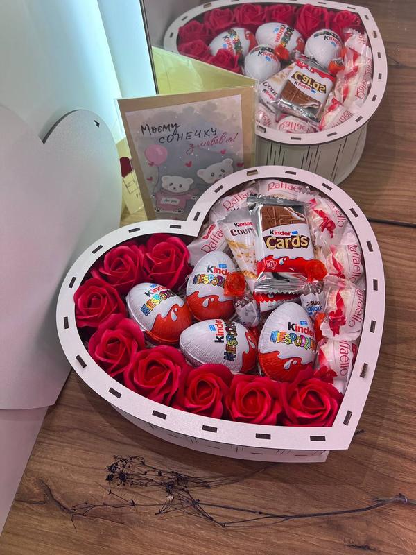 Подарочный бокс на Новый Год или на Святого Николая В бокс 🎁 входить: 🎁деревянная коробочка в виде♥️ 🎁 открытка 🎁kinder х4 🎁kinder cards 🎁kinder choko-bons-2x 🎁kinder country 🎁raffaello 7x 🎁мыльные розы