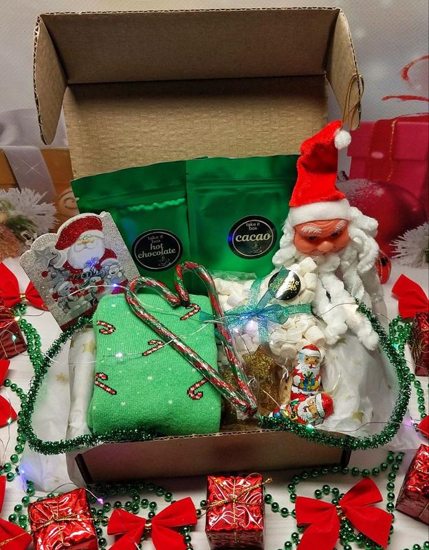 В набор входит: 1. Гарячий шоколад 2. Какао 3. Маршмеллоу 4. Шоколадный Санта 2 шт 5. Конфета "Палица" 2 шт 6. Новогодние детские носки 7. Новековое мини мыло 3 шт 8. Подвеска на елку "Санта с бородой" 9. Новогодняя открытка 10. Подарочная коробка с наполнителем и лентой