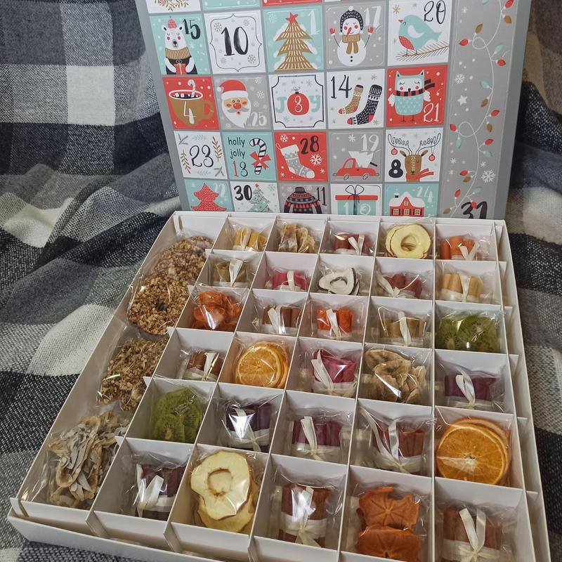 Новогодний адвент календарь с пастилой и фрипсами. В набор входит 19 вкусов пастилы, 6 видов фрипсов, бананы в кокосовой стружке и орехах, а также яблоки, покрытые медом и миксом орехов. Общий вес 1100 кг
