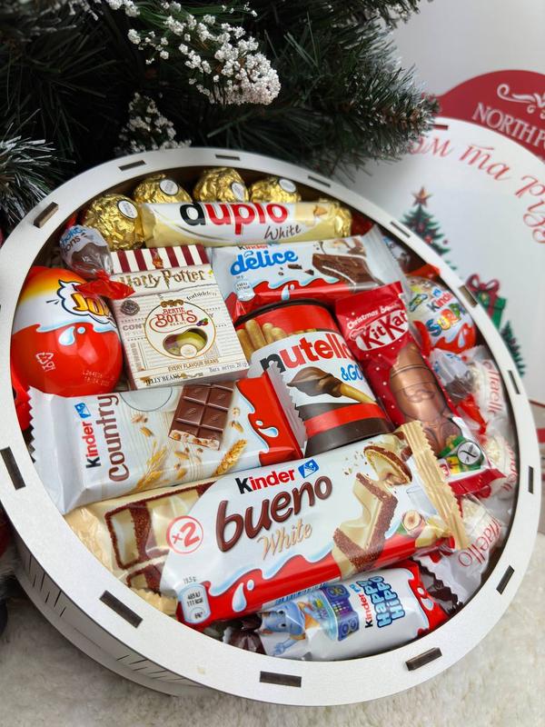 Круглая коробочка «С Новым Годом и Рождеством» Размер бокса: диаметр 27 см, высота 10 см Состав подарок: 🎄 Деревянная коробочка в виде сердечка с сердечком внутри 🎄 Цукерки RaffaelIo - 3 шт 🎄 Цукерки Ferrero Rocher - 5 шт 🎄 Цукерки Choko Bons - 3 шт 🎄 Kinder delice - 1 шт 🎄 Duplo - 1 шт 🎄 Шоколадная фигурка от KitKat - 1 шт 🎄 Kinder Happy Hippo - 1 шт 🎄 Kinder bueno - 1 шт 🎄 Kinder country - 1 шт 🎄 Kinder Joy - 1 шт 🎄 Nutella B-Ready - 1 шт 🎄 Nutella Go - 1 шт 🎄 Kinder surprise - 1 шт 🎄Цукерки Harry Potter- 1 шт 🎄 Открытка или топпер на выбор