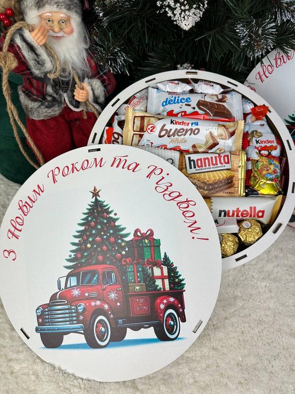 Круглая коробочка «С Новым Годом и Рождеством» Размер бокса: диаметр 27 см, высота 10 см Состав подарок: 🎄 Деревянная коробочка в виде сердечка с сердечком внутри 🎄 Цукерки RaffaelIo - 1 шт 🎄 Цукерки Ferrero Rocher - 5 шт 🎄 Цукерки Choko Bons - 1 шт 🎄 Kinder delice - 1 шт 🎄 Kinder chocolate - 2 шт 🎄Kinder bueno 1 палочка - 1 шт 🎄Kinder bueno - 1 шт 🎄Nutella B-Ready - 1 шт 🎄 Шоколадная фигурка Дед Мороз от Kinder - 1 шт 🎄Новогодние носки - 1 шт 🎄 Kinder bueno mini - 2 шт 🎄 Love is - 3 шт 🎄 Hanuta - 1 шт 🎄 Открытка или топпер на выбор