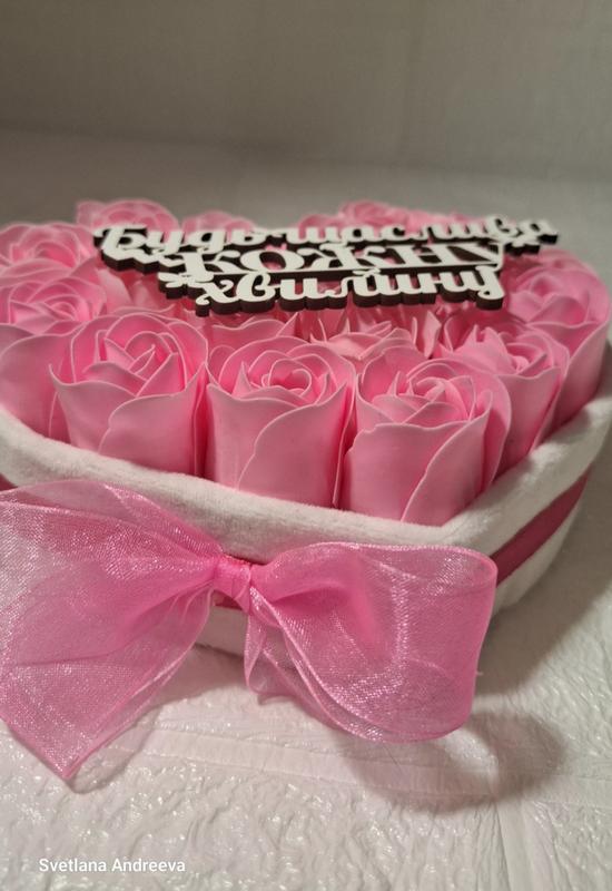 Незабываемый подарок для близкого человека В сердечки 19 роз Диаметр 17 см Надпись на выбор или вообще без надписи (крепится при заказе) Основа: оксамит (бархат)