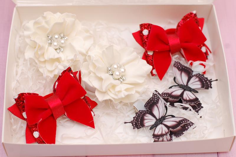 Набір прикрас виконаний у біло-червоному кольорі. Чудовий подарунок на день народження і будь-яке свято Набір складається: 1. бантики із екошкіри і оксамиту (основа - резинки) розміром 7,5*6 см 2. квіти ручної роботи із фоамірану на резинках. Діаметр квітки 7,5 см 3. заколки з метеликами розміром 5,5*5 см. Всі прикраси упаковані у святкову коробочку розміром 20*15*3 см.