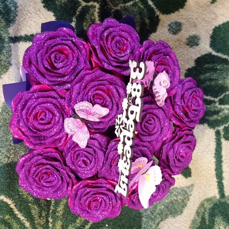 Букет выполнен в шляпной коробке, 13 атласных роз покрытых глиттером, украшены бабочками, в комплекте топпер с приветственностью. Букет в наличии. Изготовление любых композиции по вашему желанию, по фото из интернета. Праздничные, торжественные, истодные, сладкие...