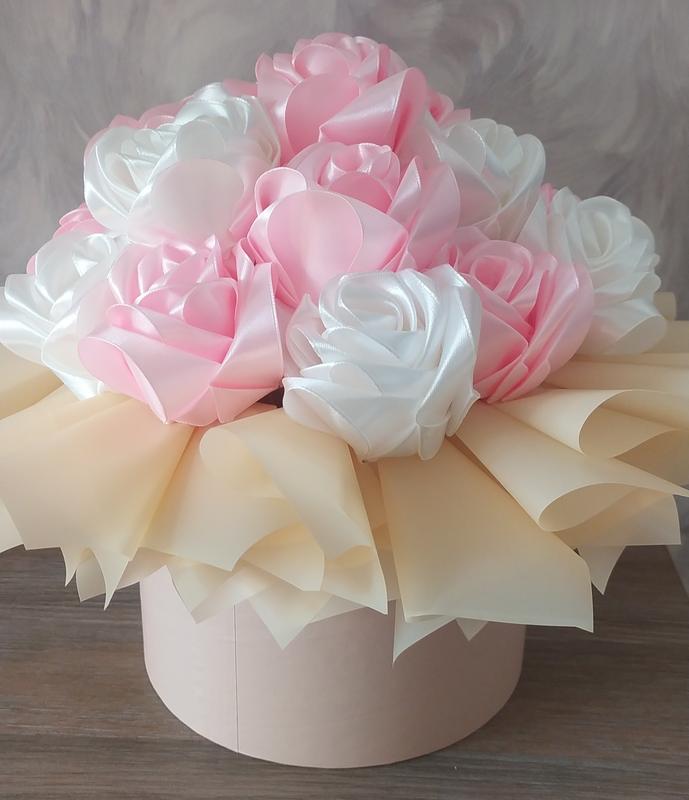 букет из атласных роз в подарочной коробке. Этой букет никогда не увядает и будет любоваться взором и вызывать улыбку, повод такого подарок.букет из 17атласных роз в коробке диаметром 18 см и высотой 16 см.чужно подойдет как на День законных,8 марта, Признание в любви,на день рождения или просто сделать приятное дорогому Вам человеку.также можно украсить помещение офиса, салона.Также можно повторить букет на любое количество цветков и любого цвета под заказ