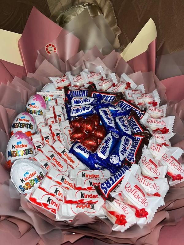 Великолепный сладкий букетик станет оригинальным подарком Хочу подчеркнуть, что большинство конфет находятся в несколько слоев. композиция достаточно объемная, ориентовано 50\50см Есть отправка новой почтой и самовывиз в городе Сумы