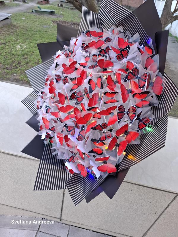 Шикарный букет красного цвета Диаметр около 60см 101 бабочка Имеет разноцветную подсветку Обращайтесь)