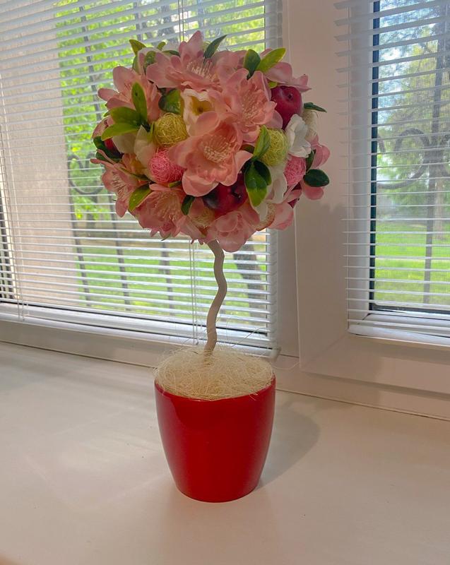 Волшебный розовый Топиарий - дерево счастья, символизирует изобилие и благополучие в доме. Используют в качестве декора дома, офиса, ресторана, подарка другу. Высота композиции 35см В доме топиарий, как советуют фен-шуй, вещь незаменимая. Особенно сильной энергетикой обладает топиарий, полученный в подарок. «Фруктовое» древесно обещает здоровье и долголетие. Топиарий в форме сердца, стоящего в спальне, притягивает любовь. Кофейное дерево наполнит воздух ароматами.
