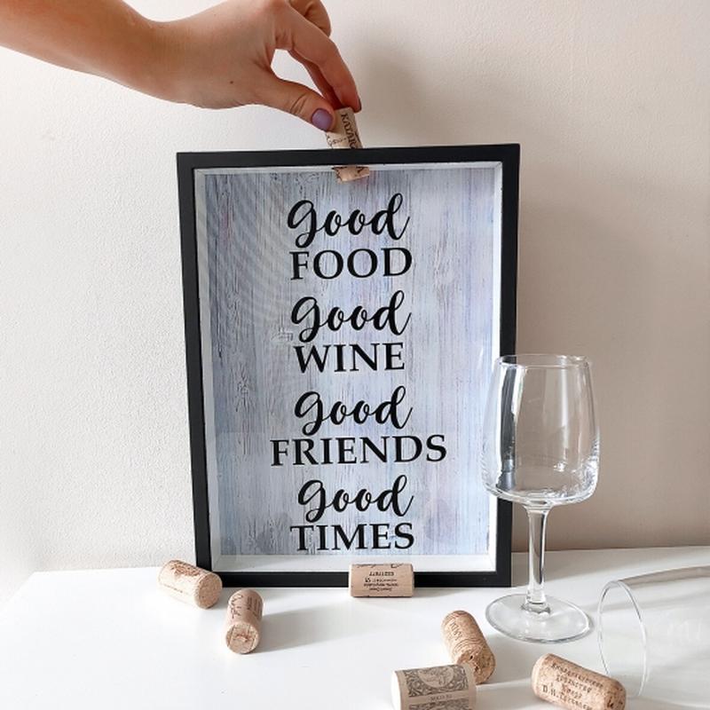 Копилка для винных пробок Good food, wine, friends, times Любителям вина и шампанского посвящается :) Коллекционируй на здоровье! Копилка многоразовая, задняя крышка снимается. В комплекте идет крепеж для крепления на стену. Будет отличным и оригинальным подарком на любой праздник! Характеристики: Размер: 30,5 х 21,5 х 4 см Материал: крашенный МДФ, пластик Цвет: черный Упаковка: коробка Комплектация: копилка для винных пробок