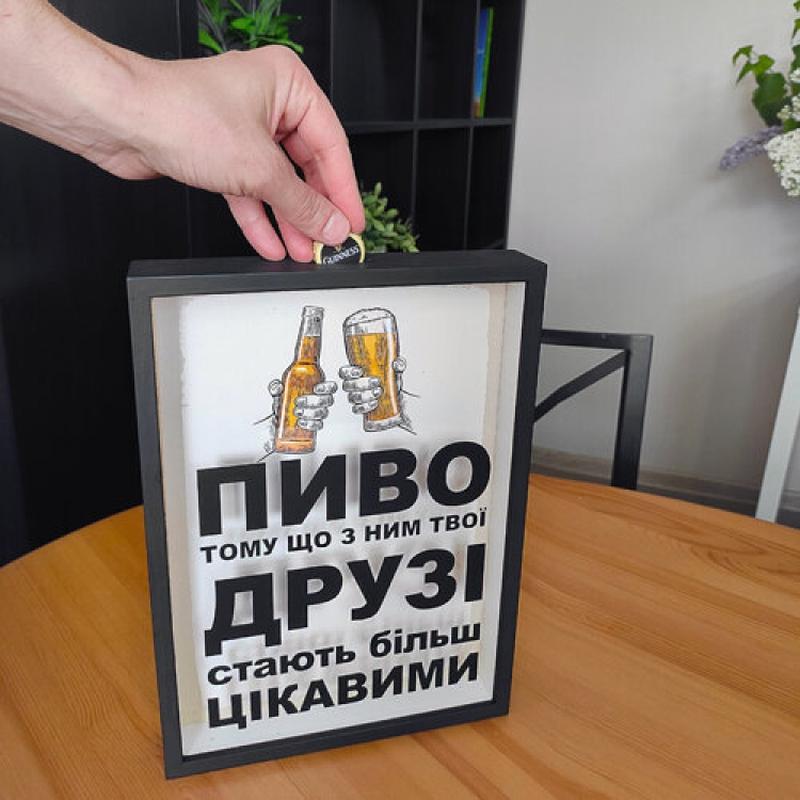 Оригинальный подарок любителям пива. Для мужчины , папы, брата, свата, друга и ... для кого угодно Теперь не придется складывать в коробочку , есть специальная копилка Копилка многоразовая, задняя крышка снимается. В комплекте идет крепеж для крепления на стену. Материал: крашенный МДФ, пластик. Размер: 30,5 х 21,5 х 4 см Цвет: черный Производитель : Украина