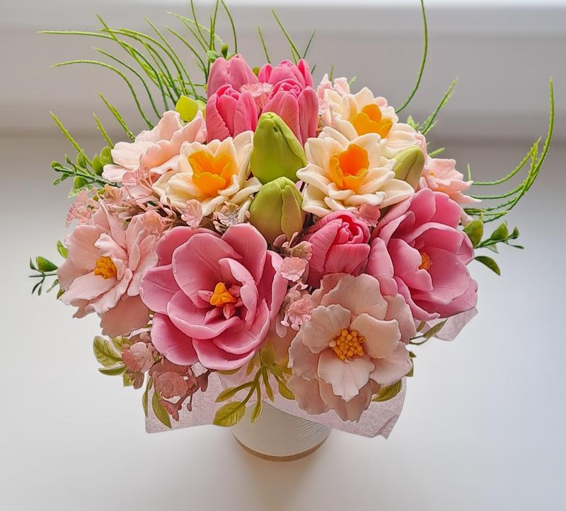 Замечательный букет из мыла с запахом свежих цветов (аромамасла США) Высота 21 см, ширина 18 см, в упаковке высота 30 см.