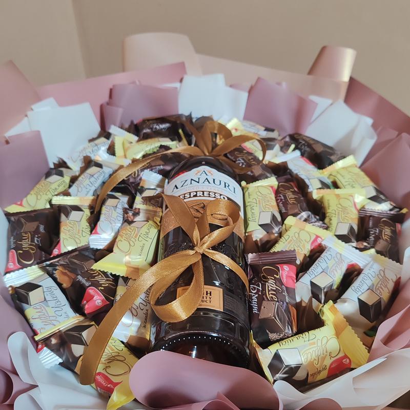 В наличии эксклюзивный и очень вкусный подарок! Большой сладкий букет, который покорит сердце каждого гурмана. Составные букета : Конфеты-суфле с нежными вкусами: -Чизкейк -Брауни -Тирамису -Та элегантная бутылка AZNAURI, придающая букету статусности и изысканности. Такой подарок станет идеальным для дня рождения, юбилея, свидания или любого особого повода. Дарите эмоции, сладости и атмосферу праздника в одном букете!