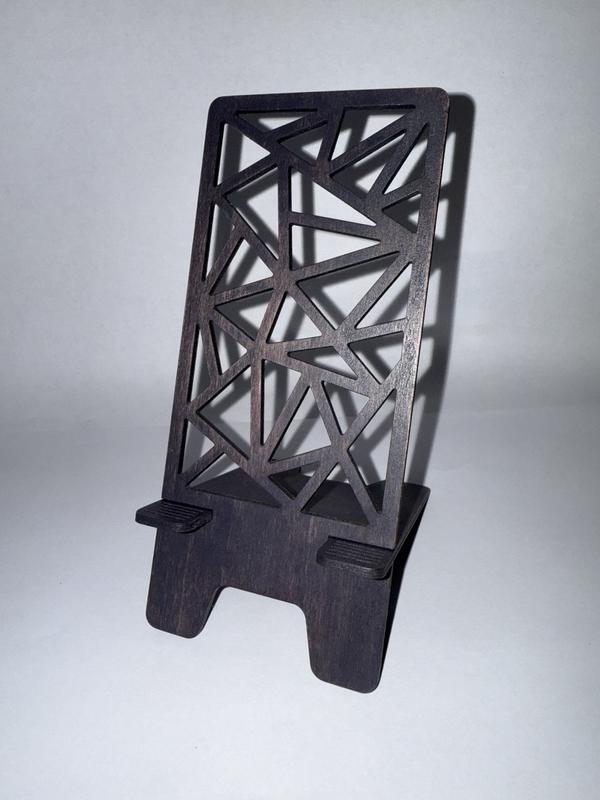 Подставка для телефона из фанеры 3 мм (бук) с геометрическим узором – стильный и практичный аксессуар для дома или офиса. Изделие окрашено в антрацитовый цвет, имеет устойчивую конструкцию и удобный угол наклона для просмотра видео, звонков или работы со смартфоном. Легкая, компактная и разборная – удобно брать с собой в сумку или рюкзак. Благодаря современному дизайну с вырезным узором подставка станет не только полезной вещью, но и оригинальным подарком для друзей, коллег или близких. Характеристики: Материал: фанера 3 мм (бук) Размеры: высота - 18 см, ширина - 8 см, глубина - 10 см Цвет: черный Декор: вырезной геометрический узор Покрытие: матовый лак Назначение: для смартфонов Тип: настольная подставка