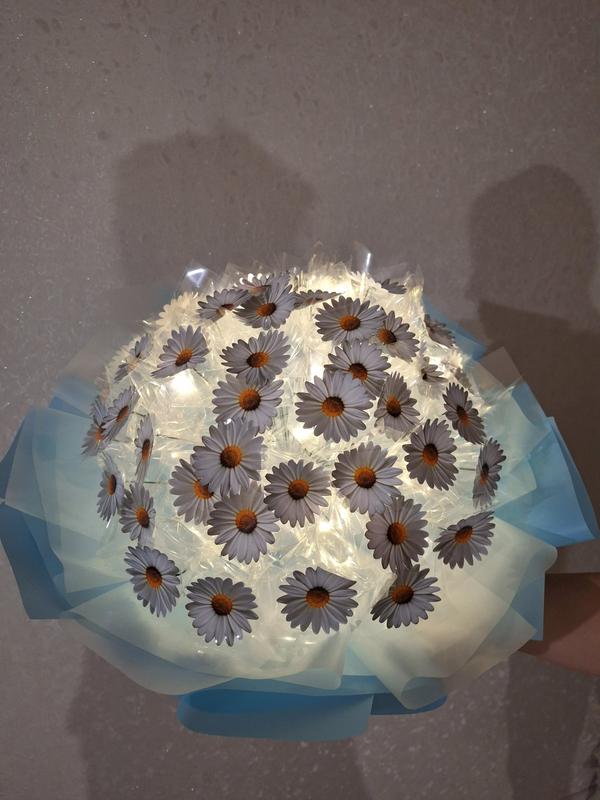 Лучший подарок на праздник! Букетик из ромашек, который фантастически сияет! Выглядит очень красиво, и празднично. Делаем на любое количество,та в любой цвет! По вашим пожеланиям. Перечень цен от количества цветочков (с гирляндой) -55 шт-650 грн -75 шт-750 грн -105 шт.-1150 грн -155 шт.-1500грн -205 шт.-1750 грн другое количество, или выполнение работы, по запросу) Перед заказом, напишите мне в уведомлениях, для уточнения количества, или цвета. Надеваю дополнительные фото букета) Изготовление под заказ от 1 дня (зависит от количества и нагрузки), тем более, что лучше заказывать за 3-5 дней до необходимой даты, чтобы он успел к вам вовремя доехать. Отправляем Новая Почта (доставка 1-2 дня), или Укр почта (доставка 5-7 дней) Ждем на ваши заказы:)