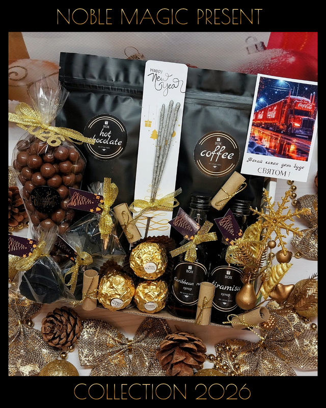 ✨🎁NOBLE MAGIC PRESENT🎁✨ Это не просто подарок - это аромат роскоши, тепло праздников и магия заботы завернуты в золото и шоколад. Идеальный вариант для коллег, партнеров, близких или корпоративных подарков 🎁 💫 Что внутри этого волшебного бокса: 1. 🎁Коробка с декоративным наполнителем и лентой - создает первое впечатление роскоши. 2. ☕ Ароматный кофе - пробуждает праздничное настроение с первого глотка. 3. 🍫 Горячий шоколад - нежный, густой и такой зимний, что хочется завернуться в плед. 4. 🥃 Сироп Caribbean Rum 50ml - тропическая нотка элегантности в каждой чашке. 5. 🍰 Сироп Tiramisu 50ml - десертный аромат для настоящих гурманов. 6. 🍬 Шоколадные шарики – хрустящее наслаждение в золотом сиянии. 7. 🍫 Ferrero Rocher (3 шт) - классика праздничного вкуса, символ роскошной жизни. 8. 🧼 Новогоднее тематическое мыло (3 шт) - ручная работа с любовью, аромат праздника в каждой детали. 9. ✨ Бенгальские огни – чтобы праздникжигал по-настоящему! 10. 📜 Новогодние приветствия в виде свитков – теплые пожелания, прикоснущиеся сердца. 11. 💌 Открытка - для искренних слов и особого настроения. 12. 🎁 Праздничная упаковка - каждый элемент продуман до мелочей. 💎 NOBLE MAGIC PRESENT - это подарок, который говорит «Ты важен» без слов. Подходит для бизнеса, любимых, друзей, партнеров — для тех, кого хочется удивить и вдохновить ✨ 📦 Доступен для корпоративных заказов!