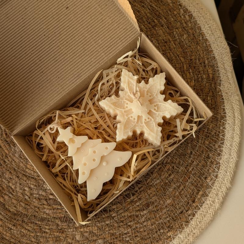 набор свечей из соевого воска в подарочной коробке свечи снежинка и елка, коробка с наполнителем и открытка