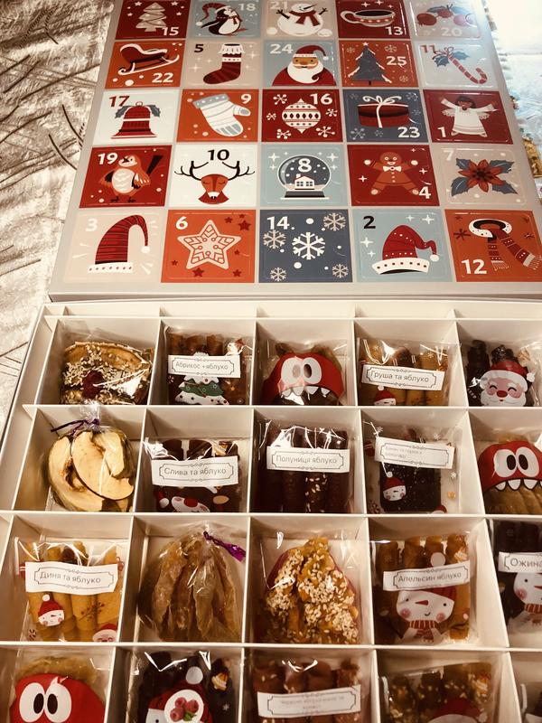 Адвент календарі на 25 днів Розмір 360/360/50 25 комірок 65/65 з натуральним вкусняшков Є сюрприз Вага 750 Ціна 850 гривень Адвент календар на 31 днів Розмір 427/427/50 30 комірок 60/60/50 з натуральним вкладенням 1 комірок 40/50/60 з маленької сюрпризом Вага продукції 850 грамів Ціна 950 грн