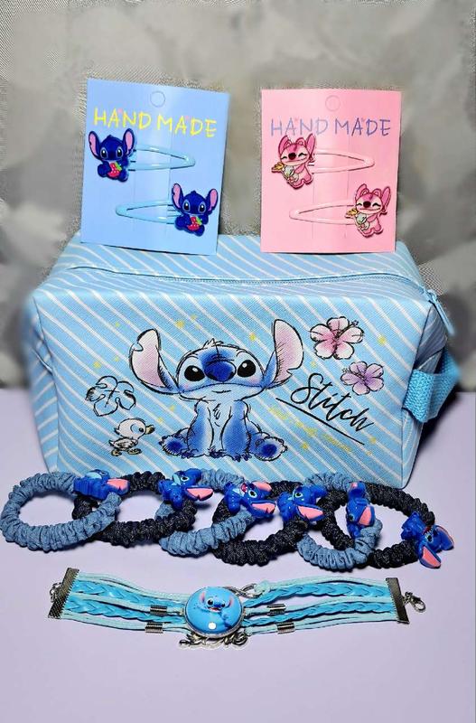 Подарочный набор Стич. В наборе косметичка, резинки для волос, заколочки, браслет ручной работы. Отличный набор для любителей Стич)