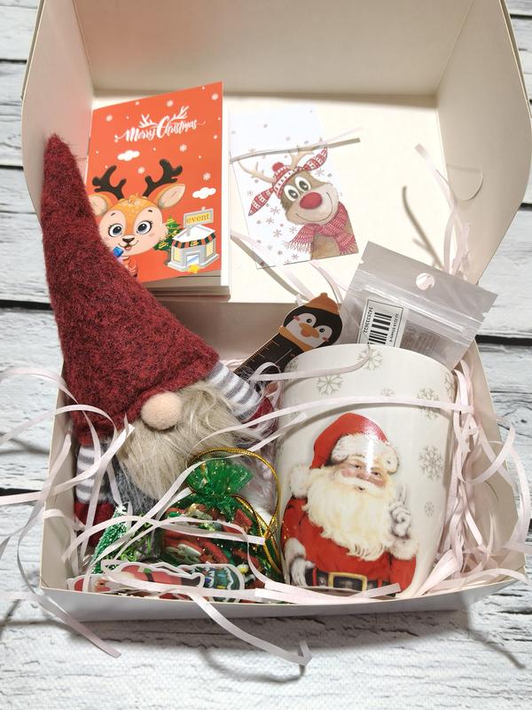 В набор входит: новогодняя чашка, скандинавский гномик, блокнот, закладка в книжку, 2 скрепки-ёлки, декоративная мини-елочка, 4 наклейки, серьги с Сантой, 4 заколки, 4 резинки для волос в мешочке из органзы, подарочная упаковка. Нова та Укрпошта.
