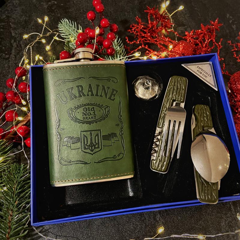 Подарочный набор украинская фляга + мультитул, зеленая, кожаная обмотка