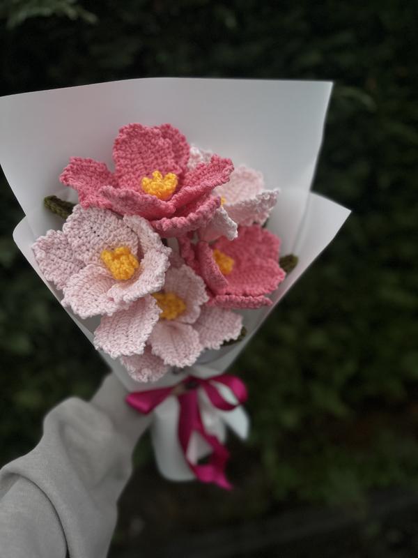 В’язаний букет квітів ручної роботи — ніжна альтернатива живим квітам, яка не зів’яне. Кожна квітка зв’язана гачком з любов’ю та увагою до деталей. Букет виконаний у рожево-пастельних відтінках, оформлений у мінімалістичний папір та перев’язаний стрічкою. Ідеальний подарунок на день народження, річницю, 8 Березня, День матері або просто «без приводу», щоб подарувати тепло. 🌸 Переваги: • 100% ручна робота • Довговічний, не потребує догляду • Оригінальний та екологічний подарунок • Можливе індивідуальне замовлення (колір, кількість квітів)