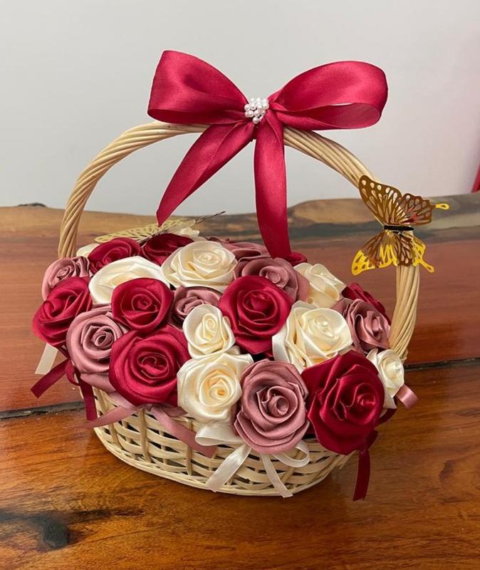 Букет из атласной ленты роз декоративный цветы из атласной ленты подарок девушке в корзине...