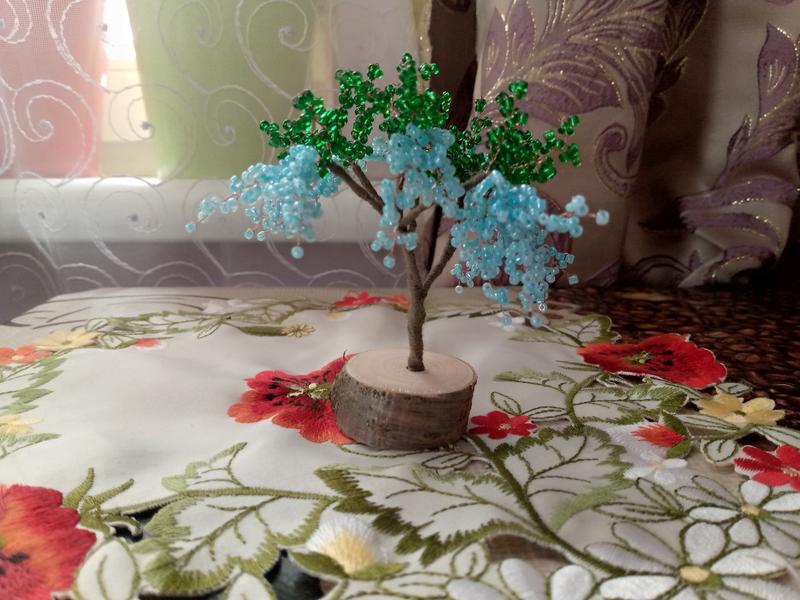 дерево из бисера с гибкими ветвями на деревянной подставке высотой 10см