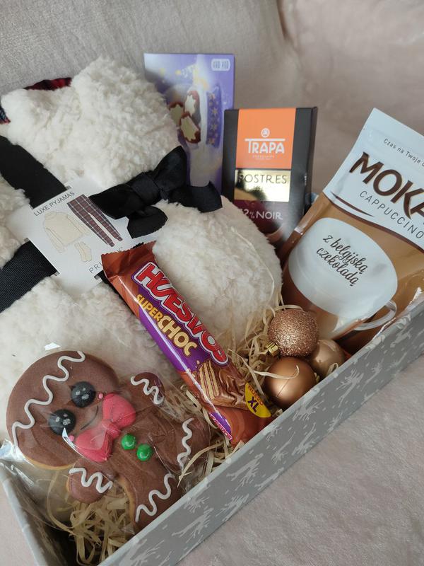 Очень красивый бокс, с приятным наполнением. Тёплая пижамка, носочки, капучино, шоколадка, печенье Milka, раскрашенный пряник и много других сладостей. Порадуйте своих близких. Наполнение можно изменить по желанию, также в наличии другие боксы.