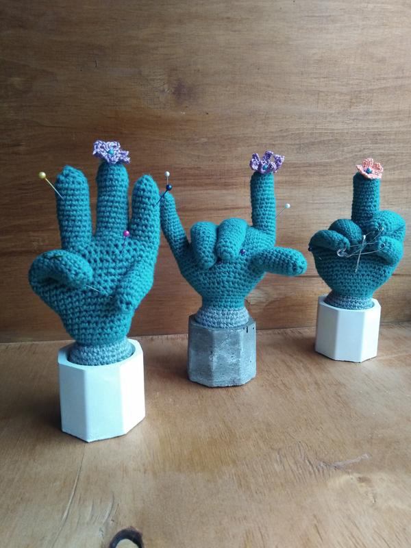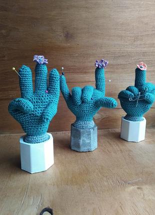 Отличные кактусы, которые не нужно поливать. Которые передадут настроение владельца окружающих. Жесты можно менять по настроению. Закрепляются пальцы шпилькой, булавкой. Растут в гипсовом кашпо или цементном. Плетеные крючком из хлопковых нитей.