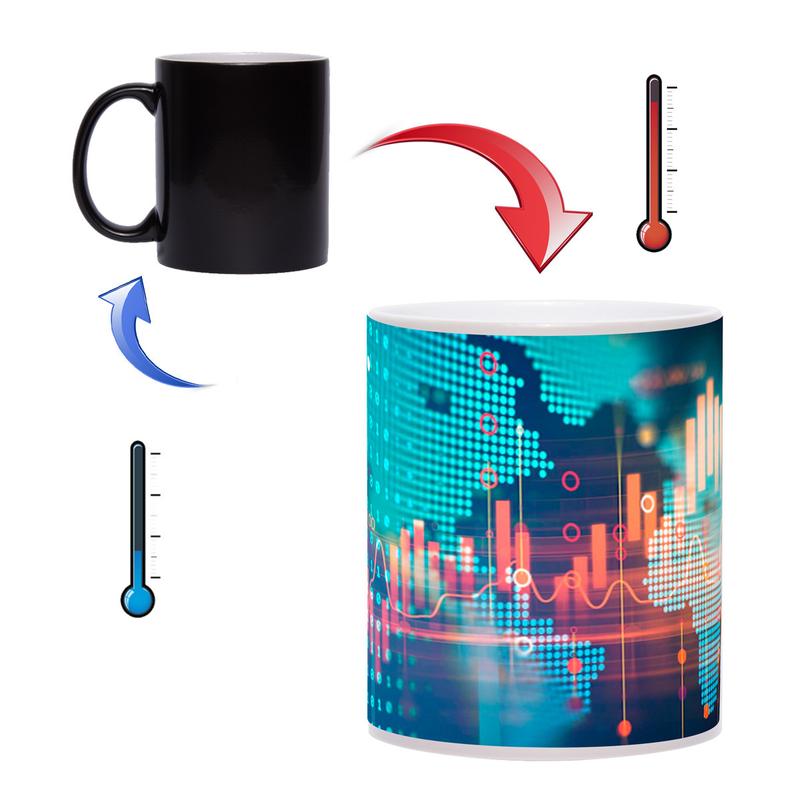 Чашка хамелеон - оригинальный подарок для Ваших друзей, коллег и близких людей. При наполнении кипятком, на чашке хамелеон проявляется красивая абстракция финансовой биржи. Данная чашка будет стильным подарком к любому празднику. Сделайте обычное чаепитие ярким и интересным с чашкой хамелеон!