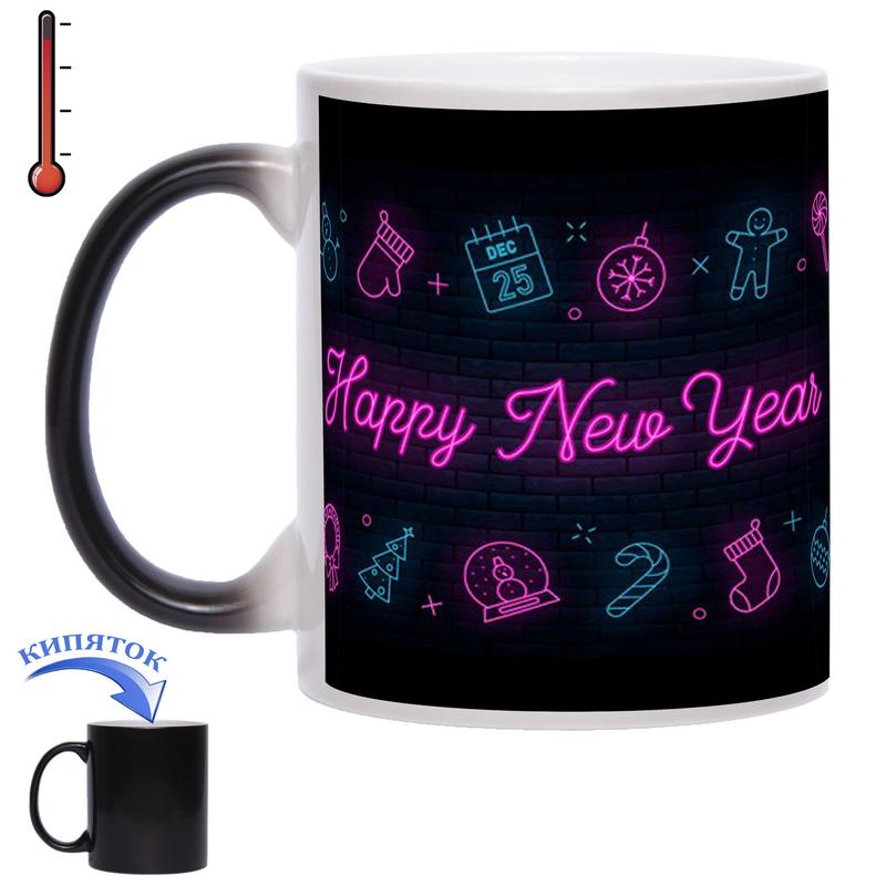 Чашка хамелеон - оригинальный подарок для Ваших друзей, коллег и близких людей. При наполнении кипятком, на чашке хамелеон проявляется надпись "Happy New Year Данная чашка станет прекрасным подарком к Новому 2020 году! Сделайте обычное чаепитие ярким и интересным с чашкой хамелеон!