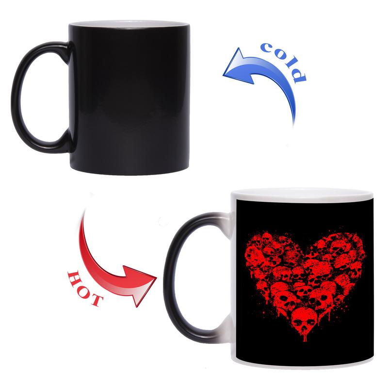 Чашка хамелеон - оригинальный подарок для Ваших друзей, коллег и близких людей. При наполнении кипятком, на чашке хамелеон проявляется рисунок красного сердца, внутри которого жутковатые черепа. Данная чашка будет стильным подарком к Хэллоуину, а так же к любому другому празднику. Сделайте обычное чаепитие ярким и интересным с чашкой хамелеон!
