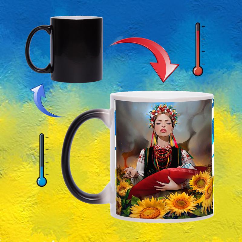 Чашка хамелеон - оригинальный подарок для Ваших друзей, коллег и близких людей. При наполнении кипятком, на чашке хамелеон проявляется красочное изображение украинской женщины. Данная чашка будет стильным подарком к любому празднику. Сделайте обычное чаепитие ярким и интересным с чашкой хамелеон! Слава Украине!