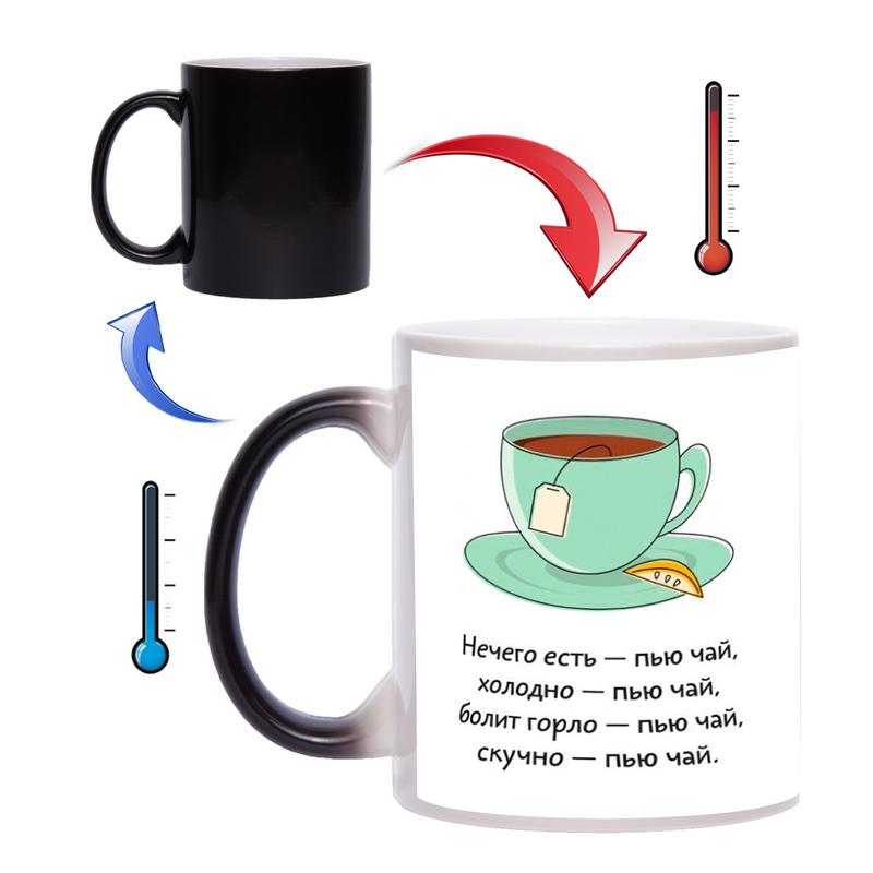 Чашка хамелеон - оригинальный подарок для Ваших друзей, коллег и близких людей. При наполнении кипятком, на чашке хамелеон проявляется изображение чашки с чаем и надпись про чай. Данная чашка будет стильным подарком к любому празднику. Сделайте обычное чаепитие ярким и интересным с чашкой хамелеон!